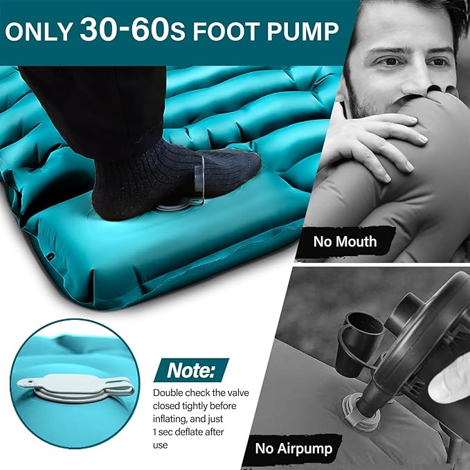 - 【Only 30s Step to Inflate & 1s Deflate】The camping mat has an innovative built-in foot pump. Just pedal 30-60 seconds to inflate it. No need to inflate it with your mouth, hands, or carry a pump. It only takes 1 second to quickly deflate. The new air release valve with no leaking film means you'll never have to worry about air leaking.