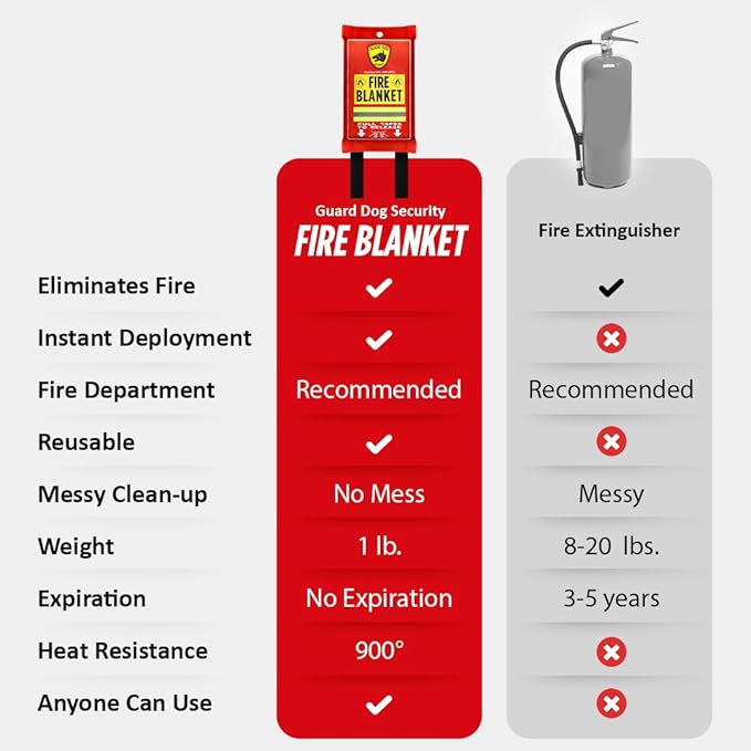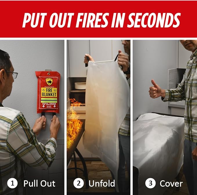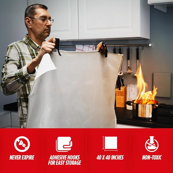 - SAY GOODBYE TO MESSY CLEANUP: Forget about the hassle of fire extinguisher residue! Our 40"L x 40"W fire blanket smothers flames in your home or kitchen by cutting off oxygen supply, leaving no chemical mess behind. This clean and effective solution lets you extinguish small fires safely without the worry of a post-fire cleanup nightmare