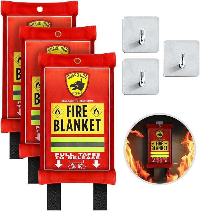 - MADE FOR YOUR SAFETY: Guard Dog Security fire blankets use top-quality, fire-resistant materials to meet EN-1869:2019 standards for extinguishing kitchen fires. With two layers of woven fiberglass and a special fire-retardant film, they can withstand extreme temperatures up to 1076℉ (580℃)