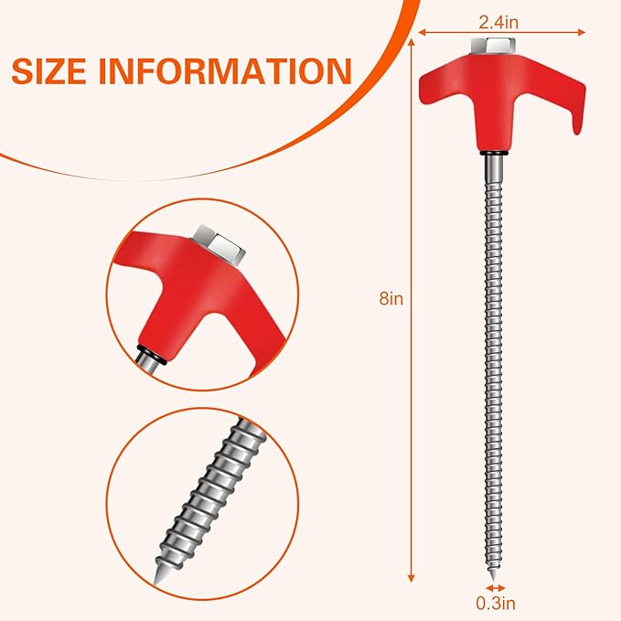 - 🔩HEAVY-DUTY TENT STAKES: Our 8" Screw in tent stakes are designed for durability and reliability in any outdoor setting. These heavy duty tent stakes measure approximately 0.25in (7mm) in diameter, are made from premium steel with corrosion resistance, provide maximum stability to keep tent secure even in challenging weather conditions.