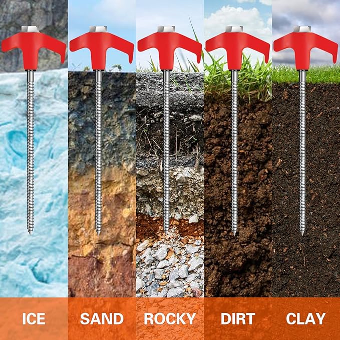 - 🔩THREADED TENT SPIKES:Ground anchors with a threaded end for a superior grip and simple insertion into a variety of hard surfaces. The threaded design enhances grip and prevents slippage, screw in tent stakes heavy duty holds firmly on grass, gravel, hard soil, and everything in between for a worry-free camping experience.