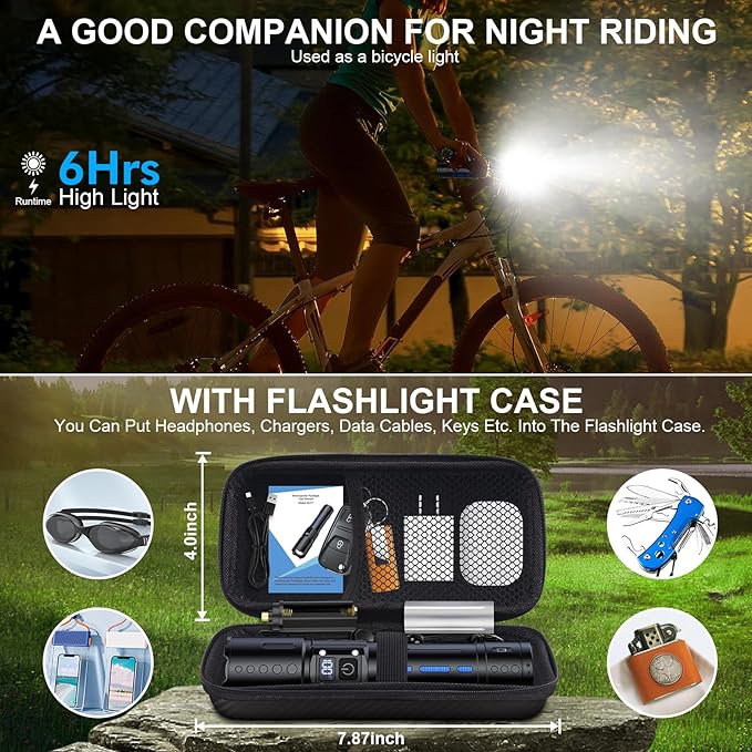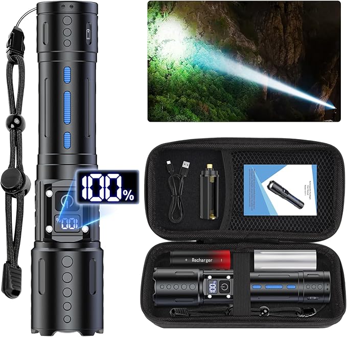 - 【TYPE-C FAST CHARGING & LCD POWER DISPLAY】Built-in TYPE-C charging port (included cable), fully charged in just 4 HOURS with any USB port. After our test, the powerful flashlight can last for up to 6 HOURS at high mode, and last for up to 12 HOURS at low mode. This led rechargeable flashlight has been newly upgraded with the unique LCD power percentage display, so you can quickly judge how much power is left.