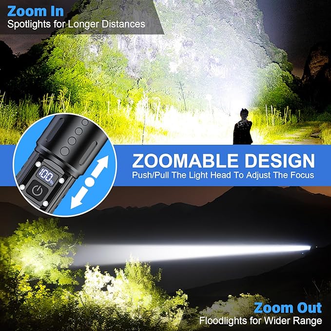 - 【SUPER BRIGHT FLASHLIGHTS & ZOOMABLE】Banral high lumens tactical flashlights is equipped with Upgraded Long Beam LED Chip, which produces a powerful and focused beam, brighter than car headlights. LED high-powered flashlight provides a max output of 20,000 lumens, the ultra-strong beam can easily focus on objects up to 1500 meters away or illuminate the whole room and backyard. TIPS: Push/pull the light head to adjust the focus.