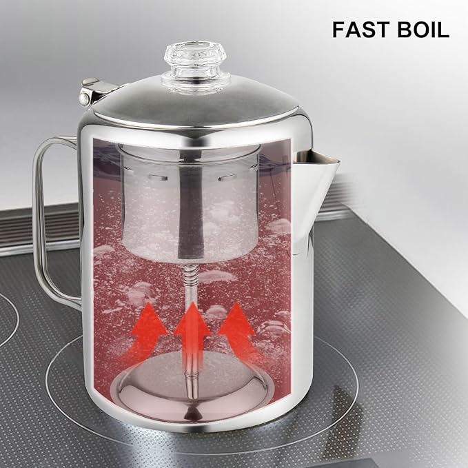 - 【FOOD GRADE MATERIAL】The percolator body, cover and filter basket are made of quality 18/8 (SS304) stainless steel, which allows it to withstand drops and impacts during use. No aluminum and plastic, toxin free and corrosion-resistant.
