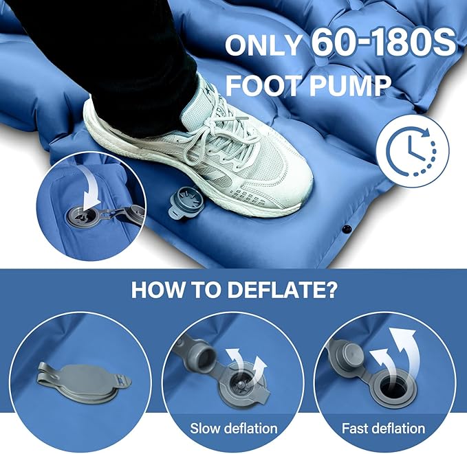 - 【EASY TO INFLATE & DEFLATE】The inflatable camping pad has a built-in foot pump that can be fully inflated in 1-3 minutes. The double-layer valves on the pillows keep air in. NOTE: How fast you pedal affects inflation time, and how much you inflate affects the hardness of the air pad.