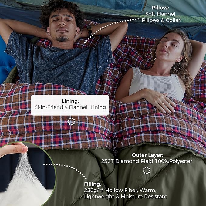 - EXCEPTIONAL WARMTH & INSULATION: Crafted with 250g/㎡ hollow fiber fill, this 2 person sleeping bag provides superior insulation for cold conditions (comfort range: 53.6°F, limit: 42.8°F, Extreme: 17.6°F). The soft flannel lining, along with a chest collar, windproof zipper flap, and adjustable hood drawstring, offer outstanding warmth retention, keeping you and your family warm and cozy, even in challenging outdoor environments.