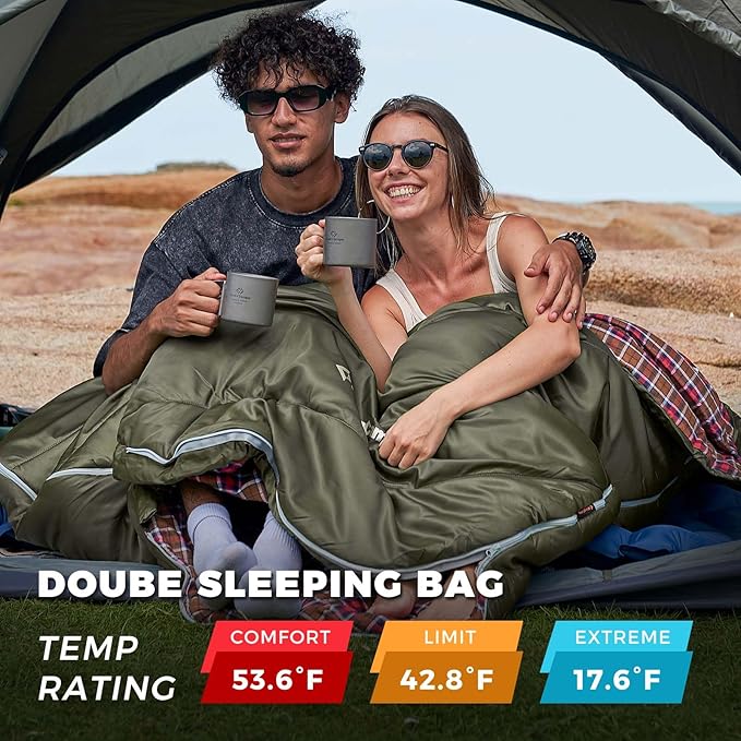 - SPACIOUS DOUBLE SIZE FOR UNMATCHED COMFORT: Measuring 94.5" x 50", this queen-sized sleeping bag offers 20% more space than most standard models, giving you and your partner ample room to stretch out comfortably. Perfect for couples or individuals who prefer a roomy sleeping experience, its expansive design ensures you can enjoy a relaxing sleep, ideal for outdoor adventures with added comfort.