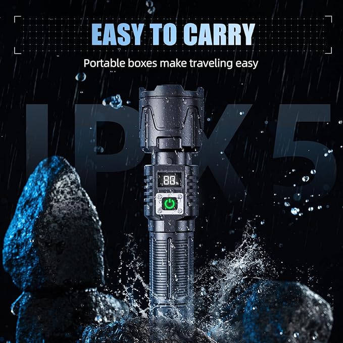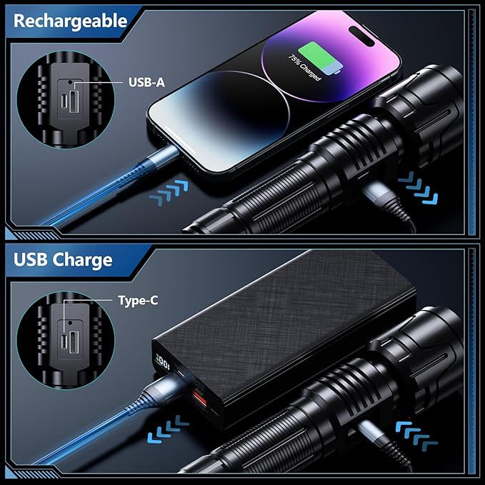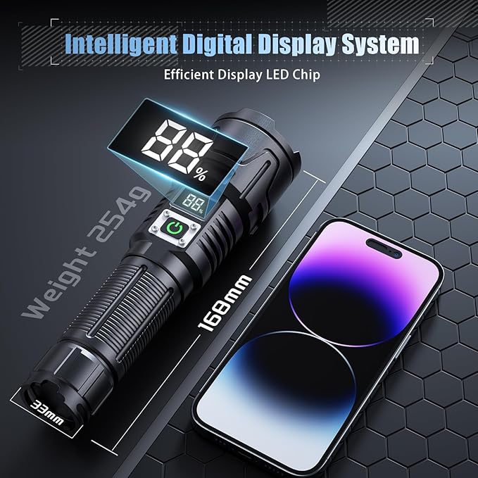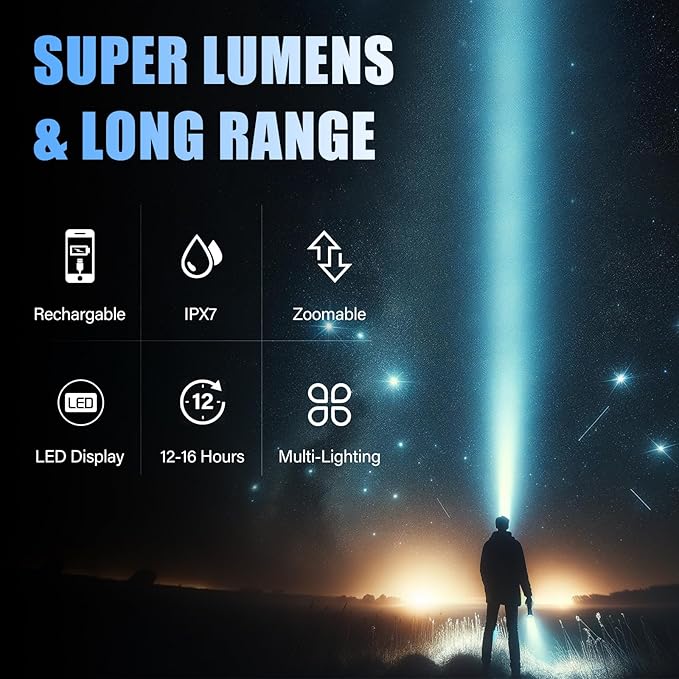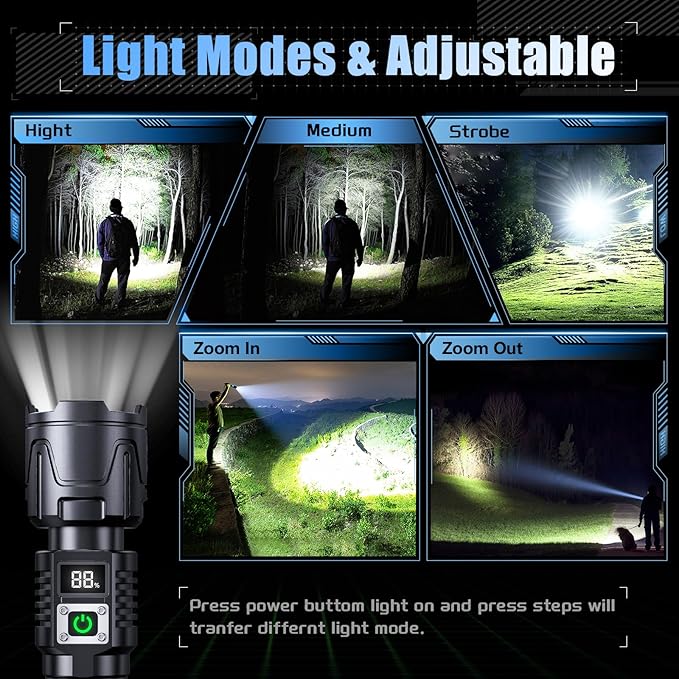 - 【Looking for a powerful flashlights 】 Experience the POHO flash light, with upgradeded P70.2 chip, which is more powerful brighter than others. Its ultra-wide beam effortlessly illuminates an entire backyard, offering double the lumen output of other. The farthest light distance up to 3280FT, the widest beam can easily illuminate the entire room or the darkness of the night.