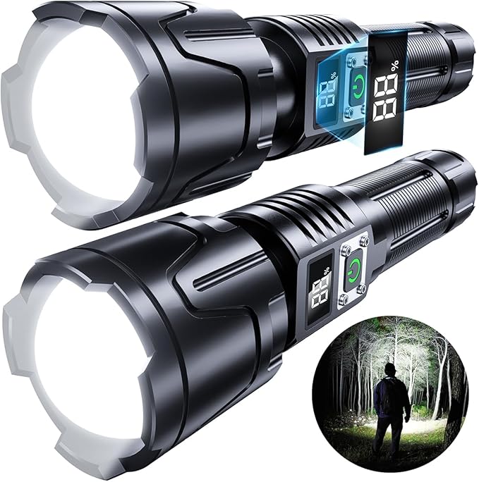 Rechargeable Flashlights High Lumens - 900000LM Super Bright Flashlight - LED Flashlight with LCD Display, Zoomable, Waterproof, Handheld Flashlights for Emergencies, Camping - 2 Pack, Medium