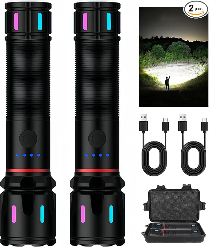 2 Pack LED Rechargeable Flashlights High Lumens, 1000+ Lumens Super Bright Zoomable Fluorescent Flashlights, Waterproof Powerful Multifunctional Flashlights for Home Camping Hiking