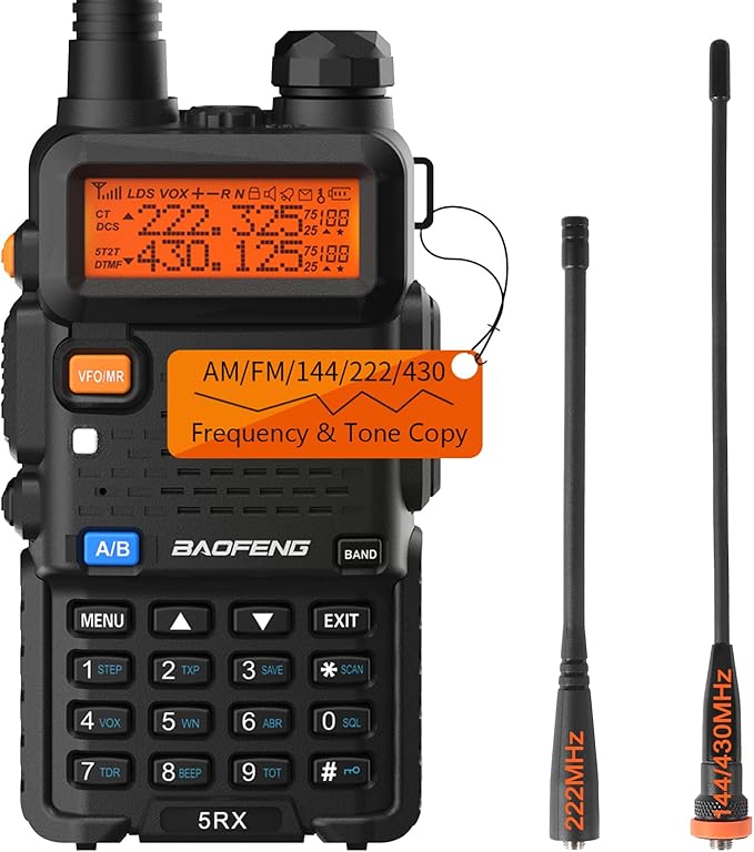 - Baofeng handheld 5RX two way radios has a built-in multi-band. Frequency range(MHz) is Transmit: VHF, UHF; Receive: FM, 108-136, 136-174, 220-260, 350-390, 400-520. Meet your needs for different frequency bands. FCC ID: 2AJGM-5RX.