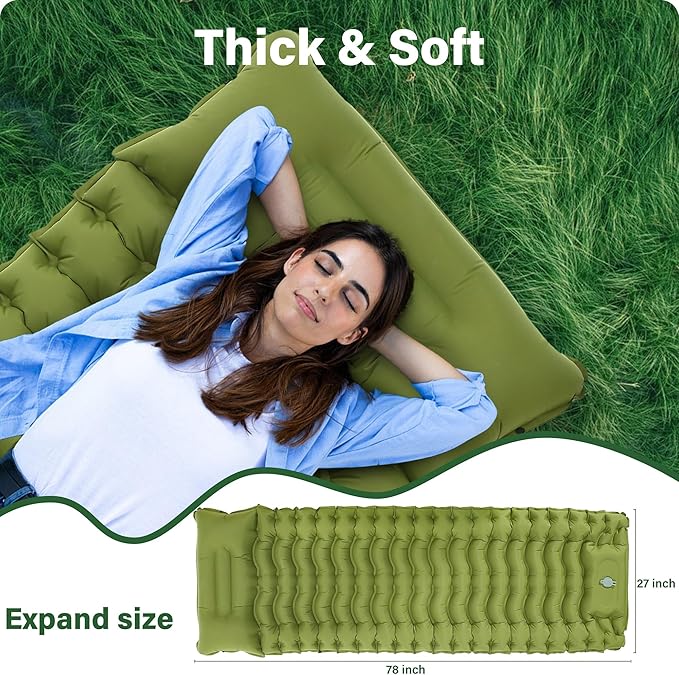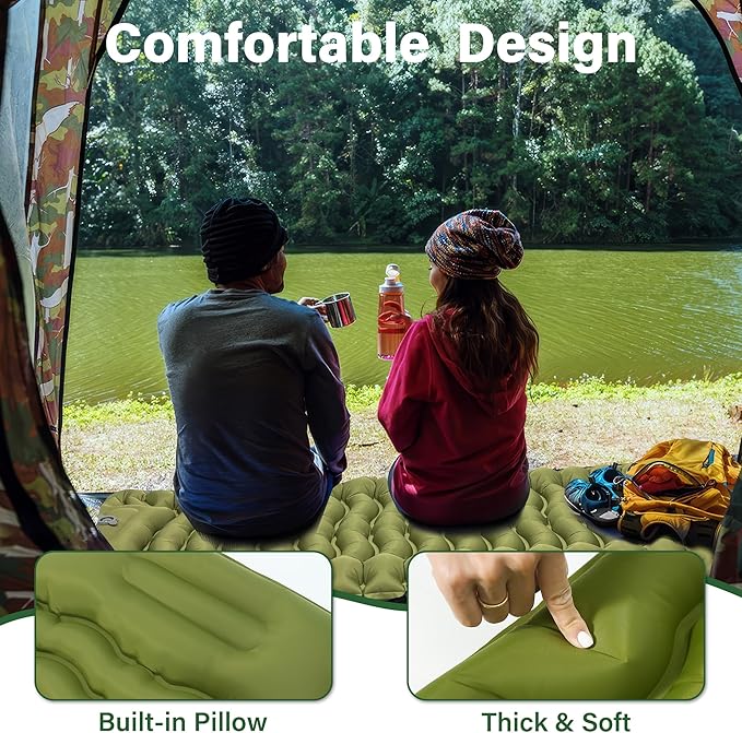 - Thick and Comfortable with Built-in Pillow:The 4-inch thick camping mat provides excellent support and comfort, ensuring a good night's sleep even on uneven ground. The built-in pillow adds an extra level of comfort, eliminating the need to bring an additional pillow. This backpacking sleeping pad is ideal for side sleepers and those who need extra cushioning for their outdoor sleep setup.
