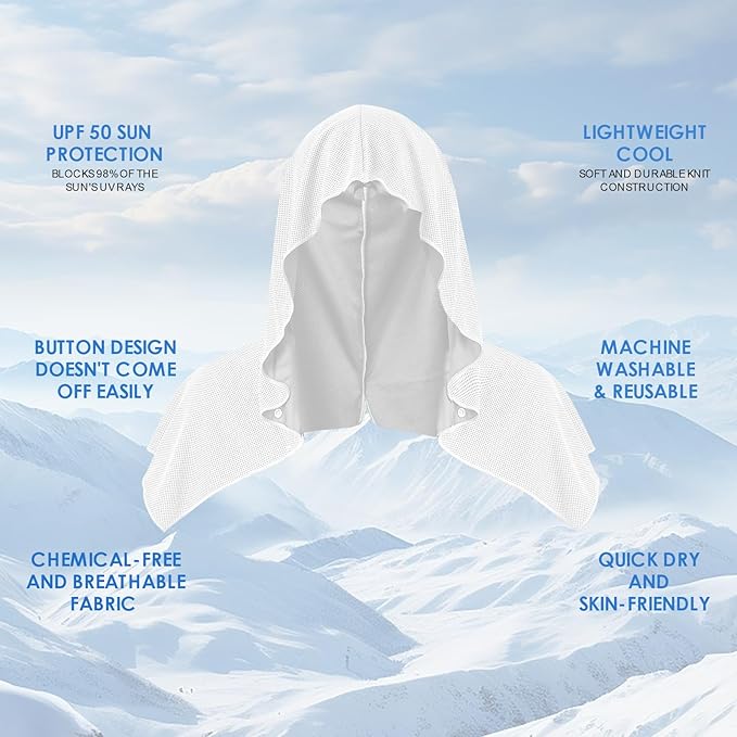 - 【QUALITY MATERIAL】:Cooling hoodie towel is made of high-quality microfibers with a mesh pattern, is breathable, UV protection, lightweight soft, durable and easy to fold. Not only skin-friendly for the neck and face or other body areas, it's also chemical-free and safety for all users. The special structural design allows it to maintain cooling and dissipate heat in summer.
