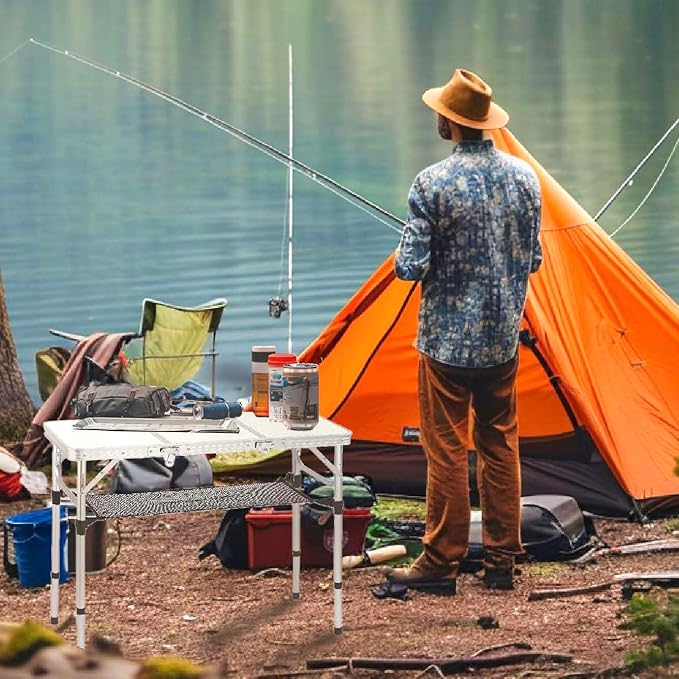 - LIGHTWEIGHT AND PORTABLE: The folding aluminum camping table is super lightweight, very easy to set up and take down.Folds up to the size of a small briefcase, with a carrying handle. Good size for car-camping and traveling