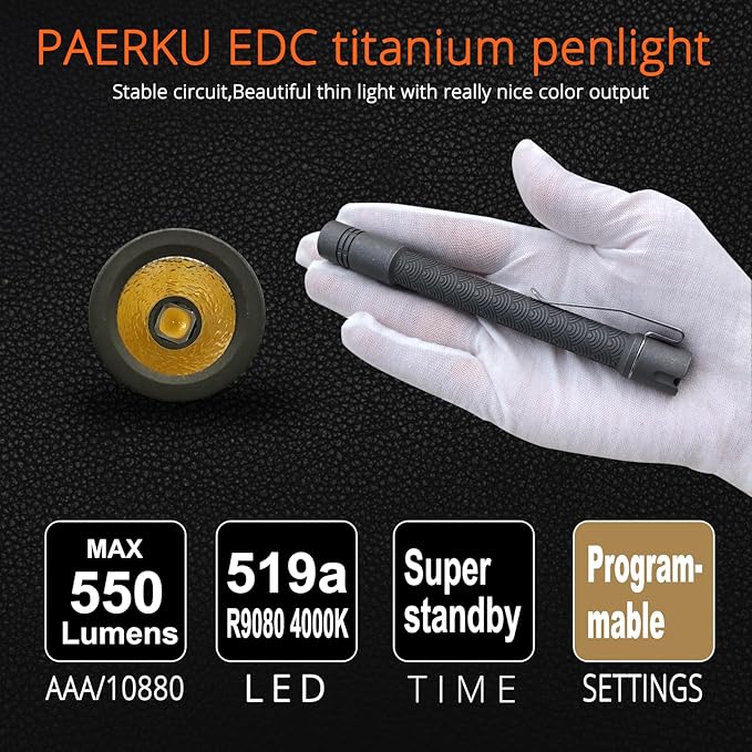 - 【 Personalized EDC experience 】 PAERKU Reylight flashlights can be customized according to the specific preferences of customers. With programmable Settings, you can adjust brightness levels, select different lighting modes, and set timers or flash modes to meet your customers' unique needs.