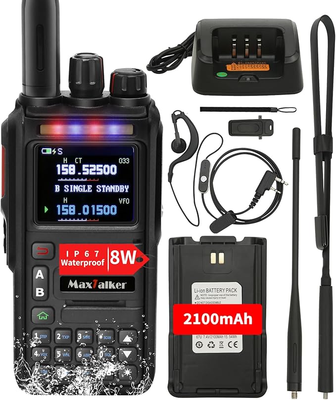 - IP67 Waterproof and Drop Resistant Features: Compared to older models, MaxTalker ham radios designed with high hardness material shell, which has better drop resistant,waterproof IP67 and dustproof capabilities(Not diving), and can meet the needs of outdoor sports, camping, mountaineering etc in the bad raining weather, which ensures the normal using reliability of the waterproof walkie talkies long range in wet environments.