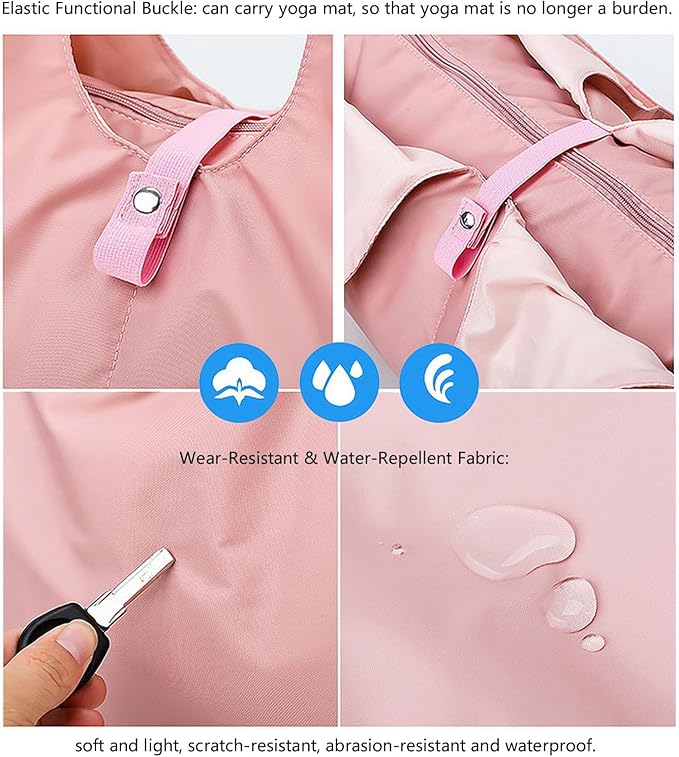 - 👉Large Capacity: 1 main large compartment, 1 small compartment inside for wet accessories, side 1 compartment for shoes with ventilation holes, middle 4 convenient pocket,and an external elastic functional buckle for fixing the yoga mat. Can hold iPad, laptop, shoes, toiletries, clothes, folding umbrella.