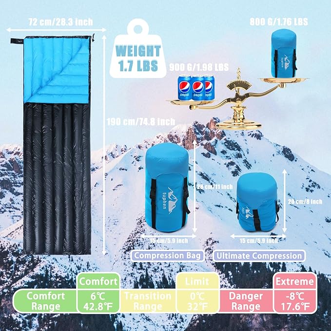 - Adequate Down Filling - The down sleeping bag is filled with about 800 grams of white down, with a high filling capacity that can accommodate more still warm air, bringing you a thick and warm feeling. Recommended use temperature: comfortable (32℉-42.8℉) / extreme (30℉-17.6℉). Camping sleeping bag features a drawstring design at the top to prevent heat loss from the neck.