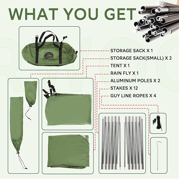 - Included Components : 1*TENT, 1*RAIN FLY, 12*STAKES, 2*ALUMINUM POLES, 2*GUY LINE ROPES