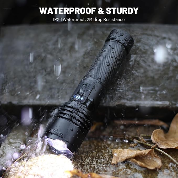 - STRONG AND WATERPROOF: The P109 bright flashlight is virtually indestructible. Constructed from military-grade aluminum, is built to satisfy the needs of everyday use. Its IPX6 water resistance and 2-meter impact resistance make the led flashlights high lumens endure rough handling and harsh weather.