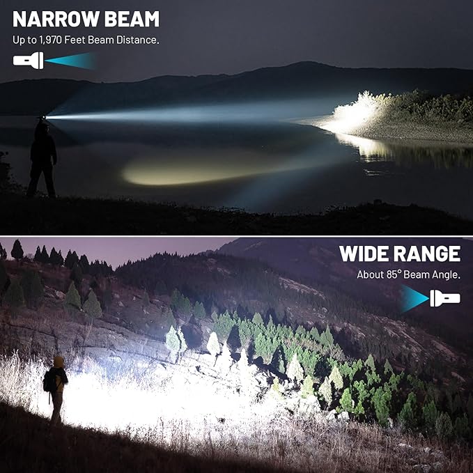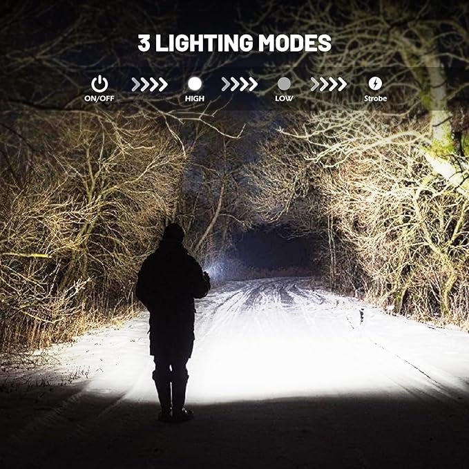 - SUPER BRIGHT 3 MODES: Simplified Light Modes! Flashlights high lumens only featuring 3 useful light modes (High-Low-Strobe), which effectively reduces the trouble of switching 5 modes. Plus, the super bright flashlight can be easily adjusted the head to focus on distant objects or illuminate large areas.