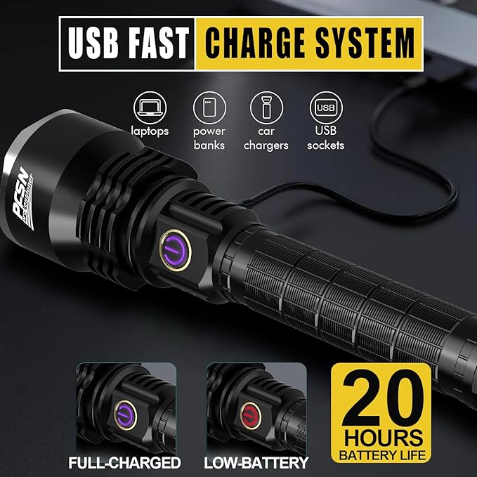 - 【2X Fast Charging System】USB C rechargeable flashlight built-in 10W fast charging port, built-in protection chip, save your time and protect your safety