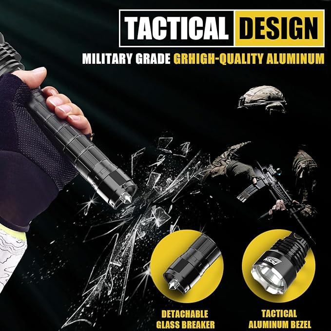- 【TACTICAL DESIGN】 The heavy duty flashlight features a tactical tail bezel (glass breaker), this high powered flashlight is perfect for law enforcement, security, truck driver and outdoor camping, hiking and hunting adventure use