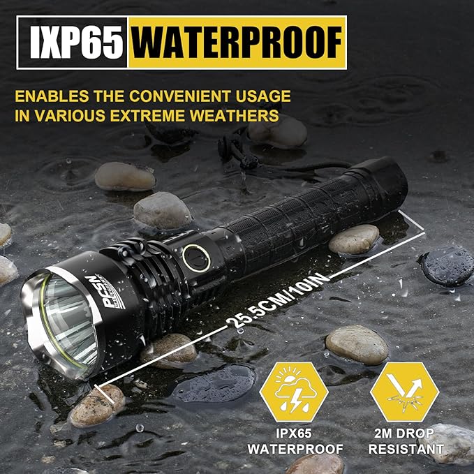 - 【LONG RANGE FLASHLIGHT】The brightest flashlight with a beam range of up to 400 meters makes it easy to navigate even in pitch darkness up to a quarter of a mile away.