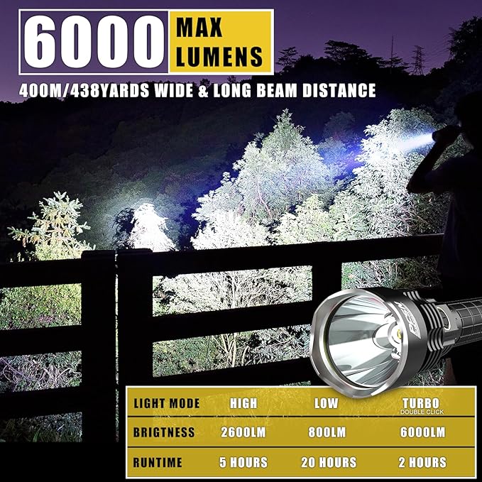 - 【STRONG LIGHT FLASHLIGHT】TCP50 powerful flashlights with a MAX output of 6000 lumens, this strong flashlight provides an intensely bright beam up to 438 yards that can illuminate large areas for outdoor activities or emergency situations