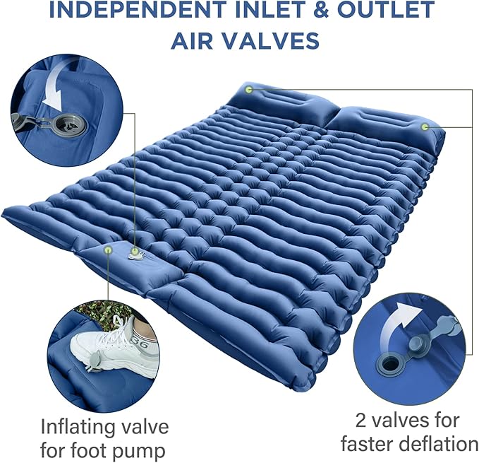 - 【EASY TO INFLATE & DEFLATE】The inflatable camping pad is equipped with a built-in foot pump, which can be fully inflated by stepping on it for 1-3 minutes, with no mouth or additional air pumps. The two double-layer valves on the pillows can effectively prevent air leaking and deflating in seconds. NOTE: Inflation time depends on how fast you pedal, and the hardness of the air pad depends on how much you prefer to inflate.