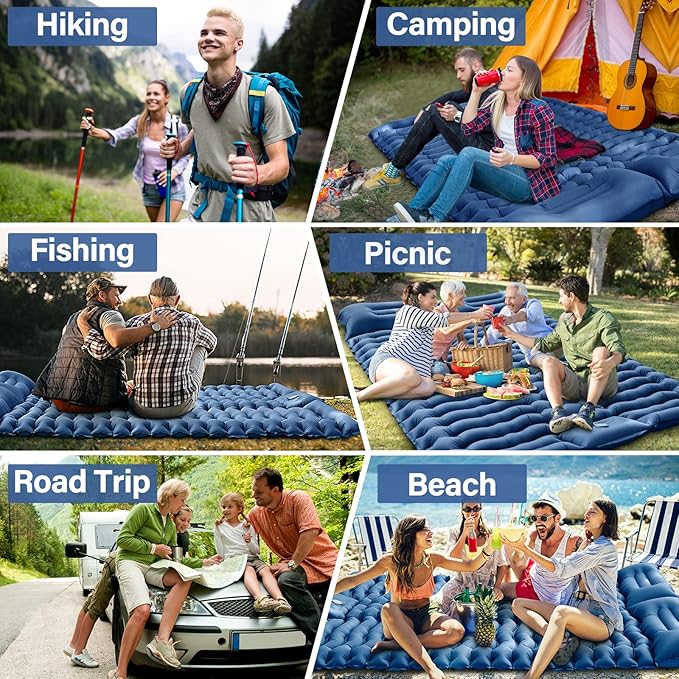 - 【EXTRA THICK & WIDE CAMPING PAD】This double sleeping pad is big enough for two tall people. It's 79.8"*53.5" when inflated, so it's perfect for sharing a bed with a friend or loved one. The 4" thickness provides better support for a good night's sleep during camping, so you can rest easy and wake up feeling refreshed!