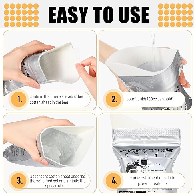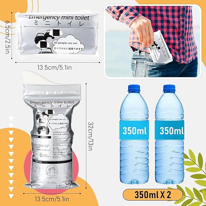 - Large Capacity & Portable: This emergency portable urine bag capacity is about 700 ml, and the urine can be absorbed the liquid into the gel within 45 seconds; the foldable pee bag is enough to fit in your pocket, purse, backpack, or vehicle glove box.