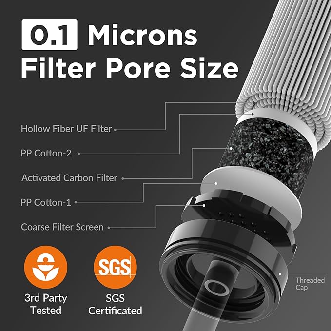 - 5-Stage Filtration - Our Upgrade 5-Stage Filtration System includes a coarse filter screen, double layer pp cotton fiber, coconut shell activated carbon and hollow fiber ultrafiltration membranes. which can remove 99.99999% of harmful substances (pollution, odor, chlorine and organic chemicals, etc.) and improve the taste. Ensuring the safest water in the worst environments.(IT DOES NOT LOWER TDS VALUE, ensuring water's essential mineral balance remains untouched.)