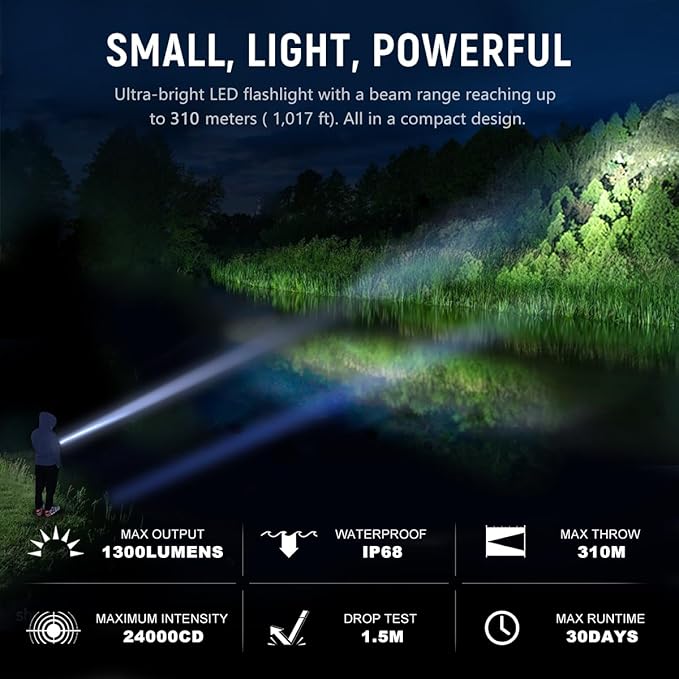 - 【High Performance】Using advanced optical engineering, this small flashlight rechargeable delivers a bright 1300 lumens beam that reaches an outstanding distance of 314m (1030ft), providing a focused and powerful light. Small flashlights features a long-lasting battery, sustaining 30 days on its minimal lumens setting. Flashlights high lumen offers strong bright illumination for camp, hiking, work, home and outdoor.