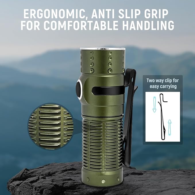 - 【Light Weight Size】The pocket flashlight is only 2.53oz and length 2.79* diameter 0.9in, probably shorter than your index finger. Making it convenient for both easy carry and emergency preparedness. Designed with a knurling pattern, mini flashlight offers a non-slip and comfortable grip, ensuring a secure hold even in wet conditions or during intense use. Two-way pocket clip can be attached to belts, pockets, hat and backpacks for every day carry.