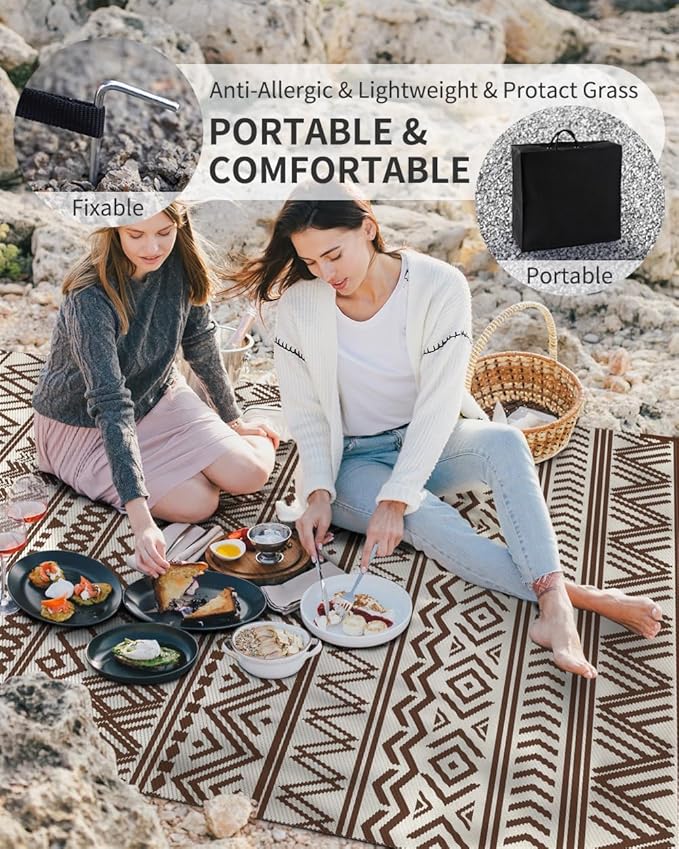 - Portable&Wide Use: It’s woven by lightweight plastic straw with several fold lines, so that this large outdoor rug can be easily fold and packed into our carrier bag. Plastic outdoor rug portable for your outings, picnics, sunbathing and RV road trips. Utility RV camping accessories and camper accessories for travel trailers. Package also includes four rug stakes to minimize billowing for outdoor use.