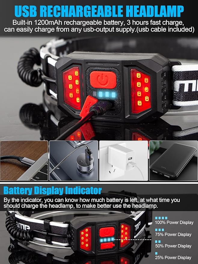 - USB Rechargeable Headlamp&Power Display --- the rechargeable lamp with 1200 capacity, fast charging in 3hours, you can easily know how much batt*ery is left by the power display indicator, so you can make better use of the headlamp. The rechargeable headlamp can be easily charged with many usb power supply such as power bank, car charger, laptop. Very convenient and economic, and SAVE MONEY!