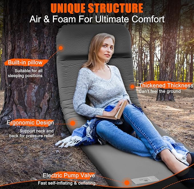 - 𝗢𝗻𝗲 𝗕𝘂𝘁𝘁𝗼𝗻 𝟰𝟬𝘀 𝗤𝘂𝗶𝗰𝗸 𝗔𝘂𝘁𝗼𝗺𝗮𝘁𝗶𝗰 𝗜𝗻𝗳𝗹𝗮𝘁𝗶𝗼𝗻 - Our self-inflating sleeping pad comes with built-in electric pump and makes inflating a breeze, just slide the button and you've got a super comfortable camping air mattress. Abandoning the old inflation method, when others are blowing or foot, you're already lying on the sleeping mat and starting to look at the stars. In addition, you can easily slide the button to adjust the pad's firmness, allowing for the best sleeping experience.