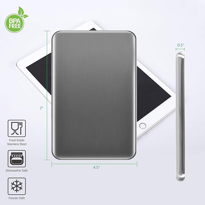 - Compact & Slim Construction: Made with high-quality stainless steel for durability and reusability. Set of 2. Size 7*4.5inch, weighted 1LBS. It's as thick as a smartphone in its protective case, and the width and height are comparable to a small tablet. And also the metal ice packs stay flat so you can put dishes on and space saving in you lunch boxes or freezer.