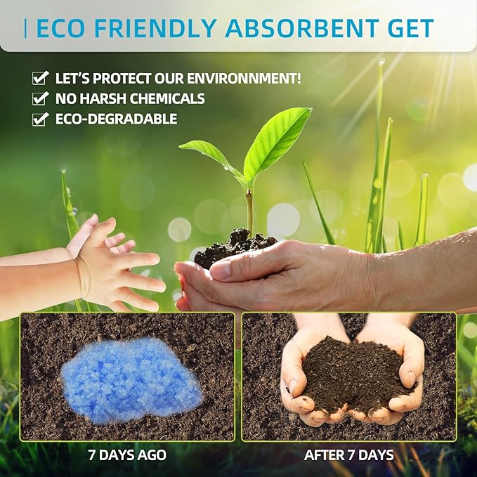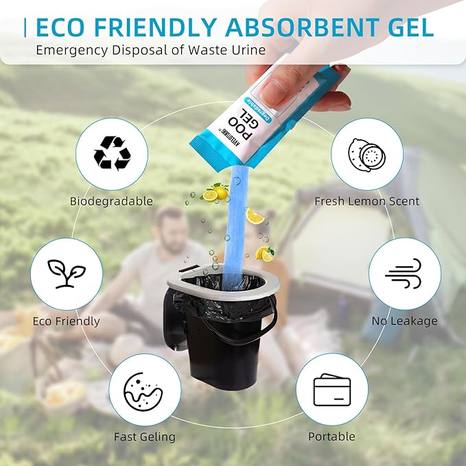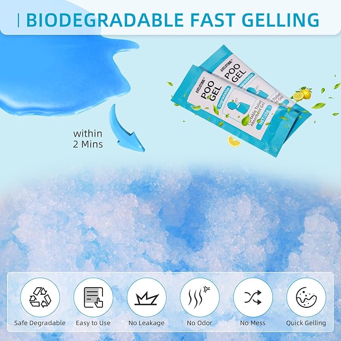 - PREMIUM ECO-FRIENDLY DEGRADABLE GEL - Portable toilet poo gel are made of environmentally friendly and healthy biodegradable polymers, can absorb large amounts of liquids and give off a subtle lemon scent. The treated liquid waste gel can be naturally degraded by the soil within 7 days, only 5 days after exposure to sunlight, making the soil more fertile. Ideal for environmentally conscious travelers