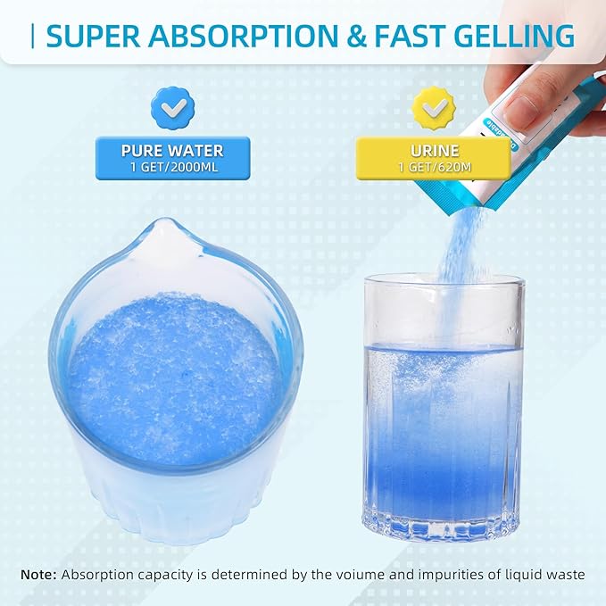 - EASY TO USE - Two methods are available: add the poo absorbent powder into a portable toilet bag, then put in the waste liquid; or pour the powder directly into the waste liquid. Wait about 1 minute for the waste liquid to solidify. Dispose of it properly after the crystals have solidified. Every 10g of waste liquid gel treats 2000ml of pure water or 650ml of urine