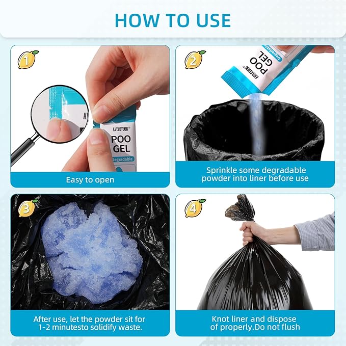 - WIDE APPLICATION - Poo absorbing powder is widely used in camping toilet potty bags, and other liquid waste composting bags, portable toilet bags, wag bags, urine bags, toilet bags, portable toilet bags, nursing emergency bags. It can also be used for portable toilet buckets, porta potty, camping toilets, emergency toilets, etc. Also suitable for camping, hiking, boating, fishing, beach, RV trips, outdoor shower tents, camping showers, home care, schools, hospitals, nursing homes, etc