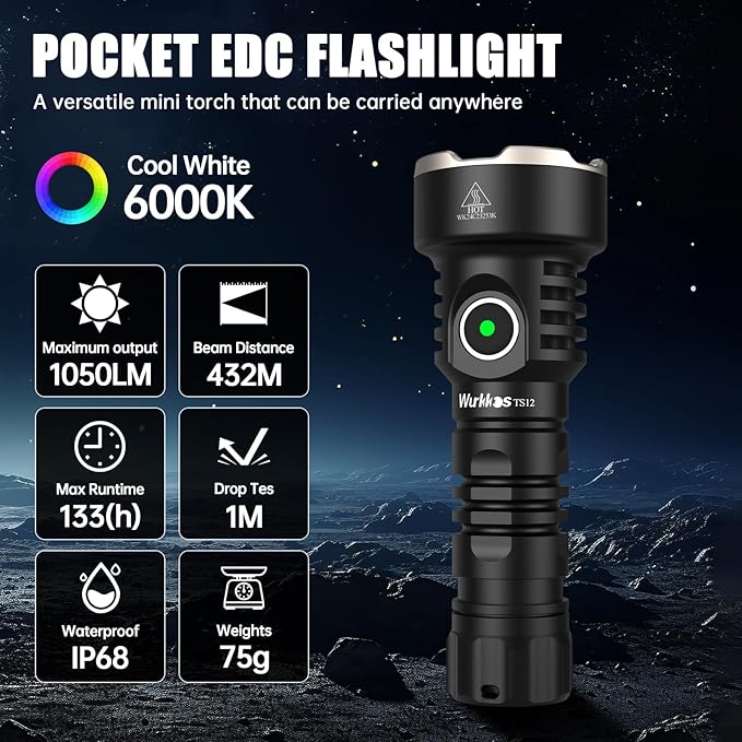 - 【8 Lighting Modes】Wurkkos TS12 is a updated EDC Flashlight, featured with 8 adaptable light modes: Moon/Low/Medium/High/Brightest/Strobe/SOS/Beacon. Our small flashlight has a memory function that remembers the last mode it was turned off.