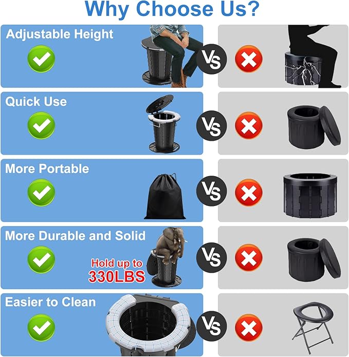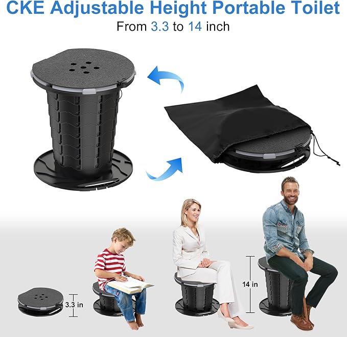 - 【Adjustable Height & Unique Locking Design】This Retractable Portable Toilet freely adjust any height from 3.3 inches to 14 inches, cater to everyone's needs at all times, just need to find the right height, suitable for most of children, elderly, male or female. This folding toilet portable potty with unique rope-locking design to prevent the toilet spreading when folded, easy to carry. Also with toilet paper holder, allowing you to use the toilet without needing to hold onto your supplies.