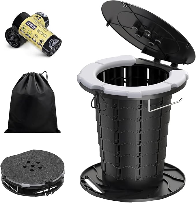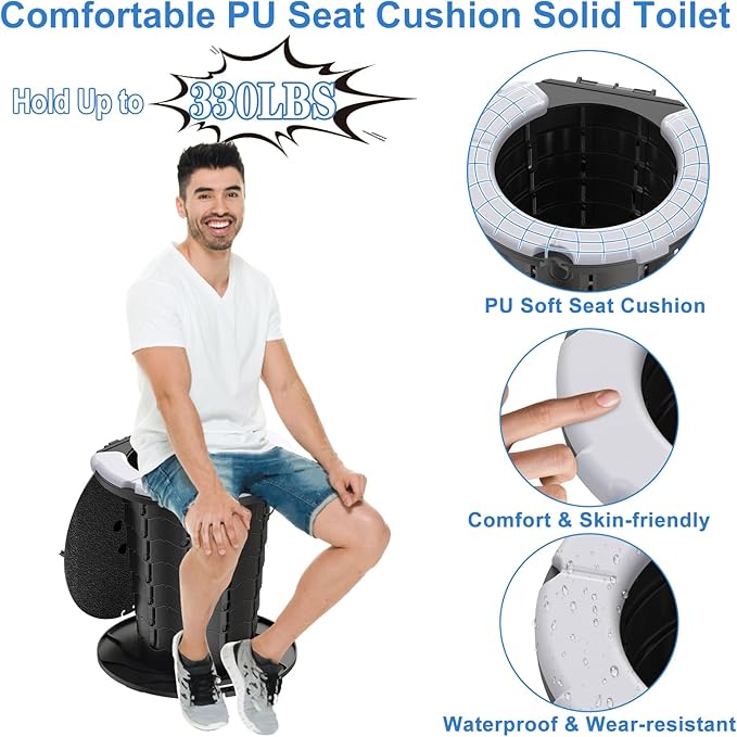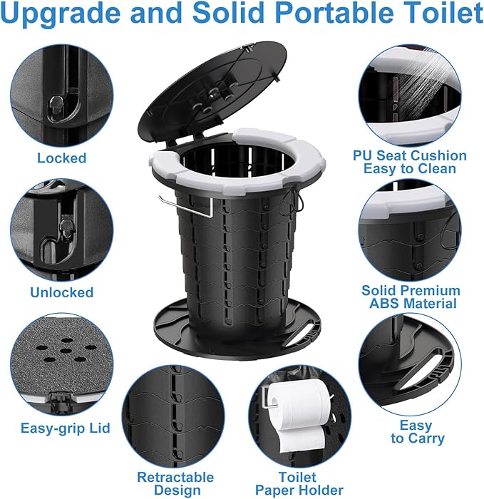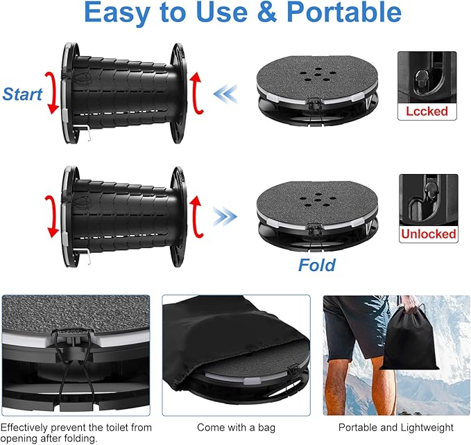 - 【Quick & Easy Use Design】This toilet camping portable potty quick and easy to use, allows you to install and remove it in less than two seconds. Just pull and twist clockwise to get started instantly! Make sure all buckles are tightly locked before use. After use, simply rotate counter clockwise and press it down into a disk. This porta potty for camping compact and lightweight, easy to carry and place it in your backpack, luggage or cars.