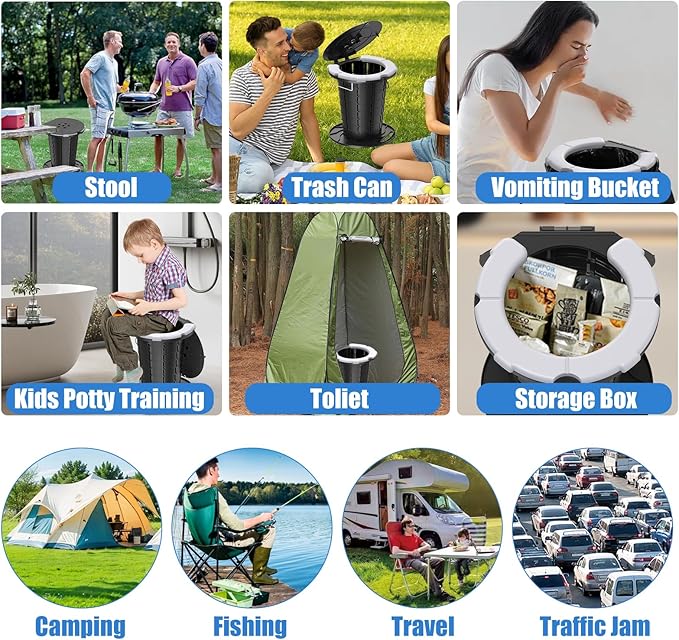 - 【MULTI-Functions】This camping potty portable folding toilet with lid has multiple uses, it can not only be used as portable toilet for camping, hiking, long trips traffic jams, traveling, roadtrip, popup tent, truck drivers and more, it can also be used as a stool, trash can, storage bucket, bar bucket, and even as a toddler potty to practice using it on your child. In addition, we are also give a waterproof storage bag. Convenient for you to put it in your backpack or car trunk when not in use.