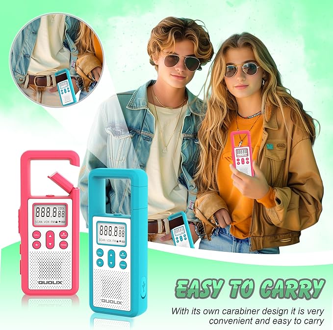 - 【Portable & Colorful】The walkie-talkie is ergonomically designed to fit comfortably in your hand, and is equipped with a hook design that makes it easy for you to carry.Colorful and energetic, perfect for young people.