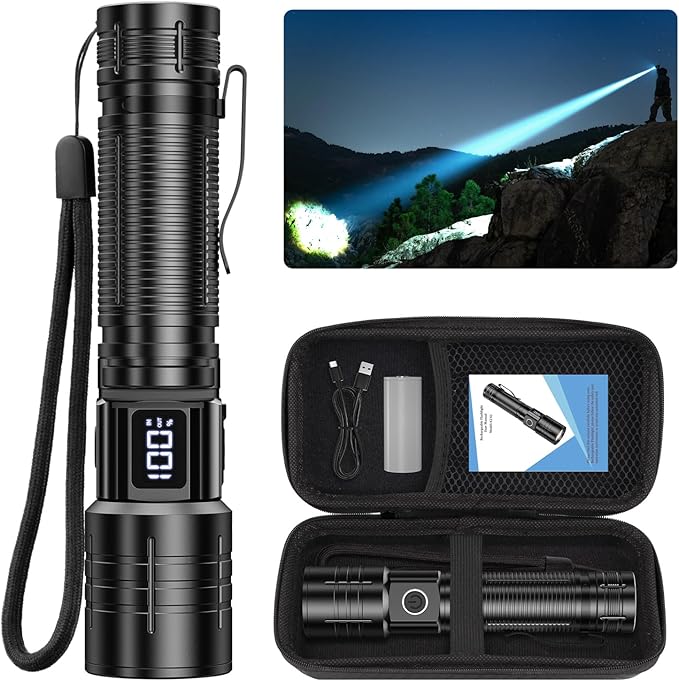 - Waterproof & Power Display: Made from aircraft-grade aluminum alloy, featuring an IPX5 waterproof rating, can keep working during hard rain, waterproof enough to encounter most situations. Built to withstand tough conditions, this small flashlight powerful is both waterproof and shockproof. The led rechargeable flashlight power display lets you know the power status of the handheld flashlights in real time
