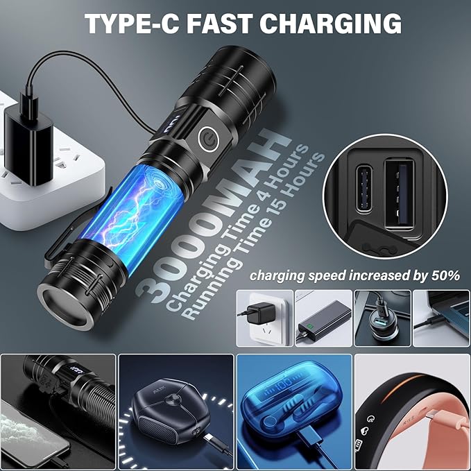 - Fast Charging & Long Time: This tactical flashlight has been completely improved to shorten the charging time and extend the service life, bright flash light fully rechargeable in just 4 hours and offers 15 hours of continuous light. Built-in USB charging interface, usb flashlights high lumens can be charged through socket and laptop, also has a power output function, so you can use it as a mobile power supply to charge your device through the cable