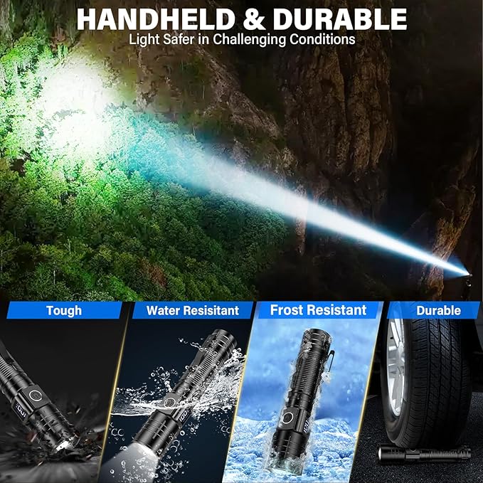 - Super Bright Flashlight & Memory Function: Delivering up to 100000 lumens, this brightest flashlight can illuminate distances up to 1640 feet. The memory function automatically restores the last used mode, ensuring convenience in repeated use. high lumens flashlights perfect for outdoor adventures, emergencies